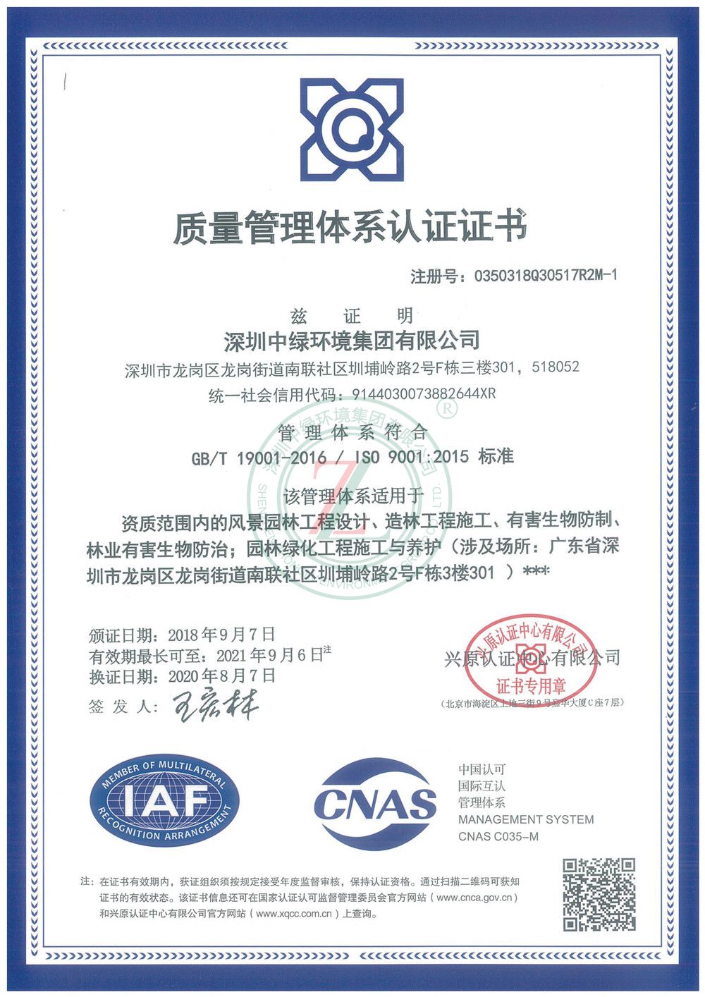 質量管理體系認證證書(園林-設計-造林)